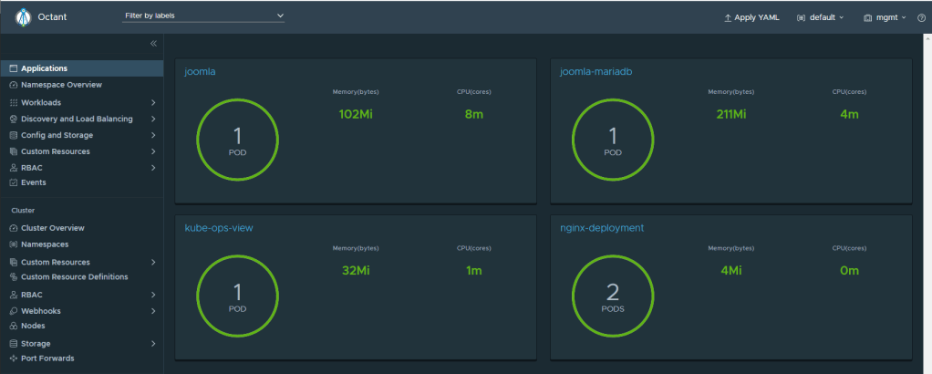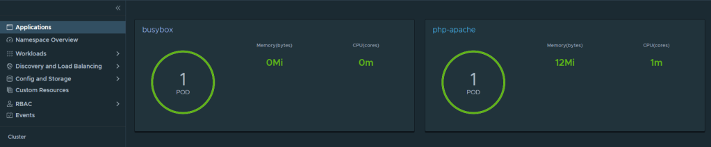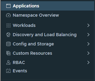 In the upper group of the properties that is dedicated to the namespace objects we see the application side of things. All of the objects that will be created in a namespace will be here to see and manage, for example when applying a new YAML file it will show up on a namespace level.