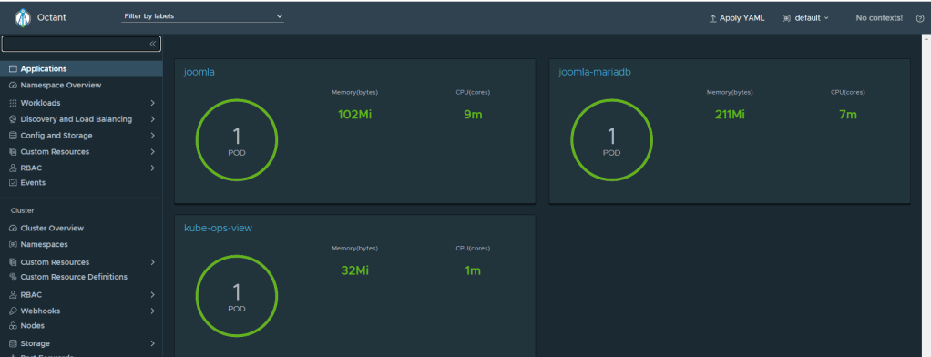 Octant work in a very simple way. All you need to do is load your Kubeconfig file and get visibility to all of the Kubernetes clusters you manage. In addition Octant will allow you to make changes, such as edit Kubernetes objects in your clusters and connect to the pods console shell through the Octant web interface.