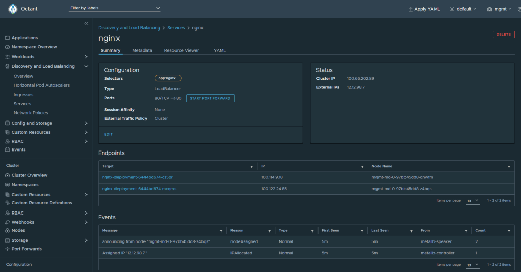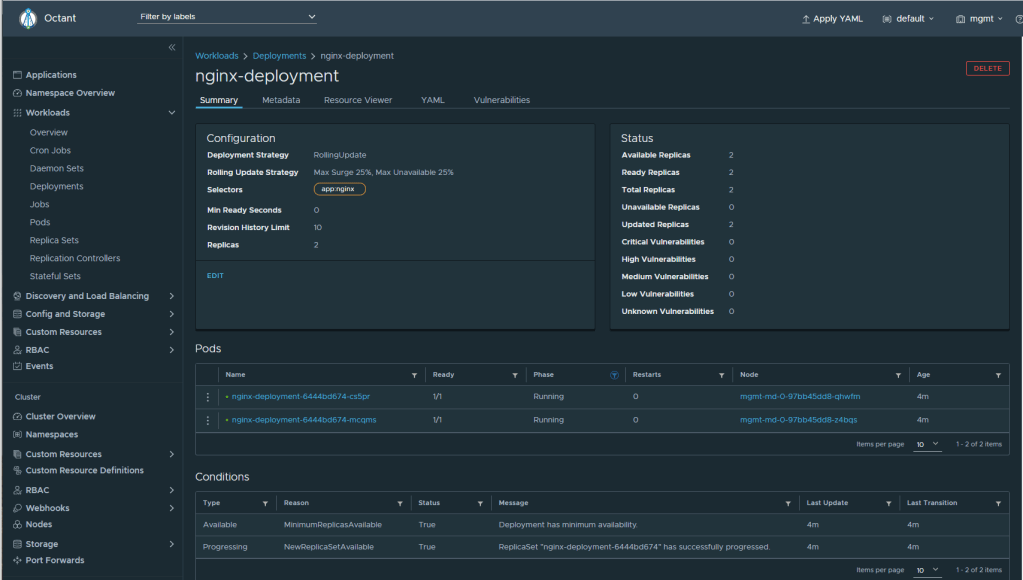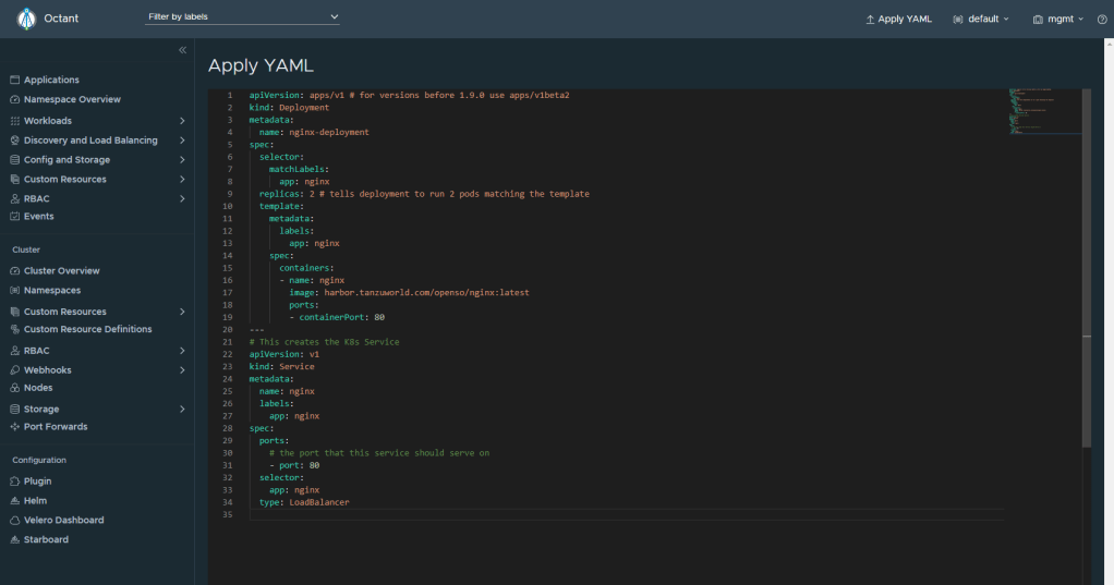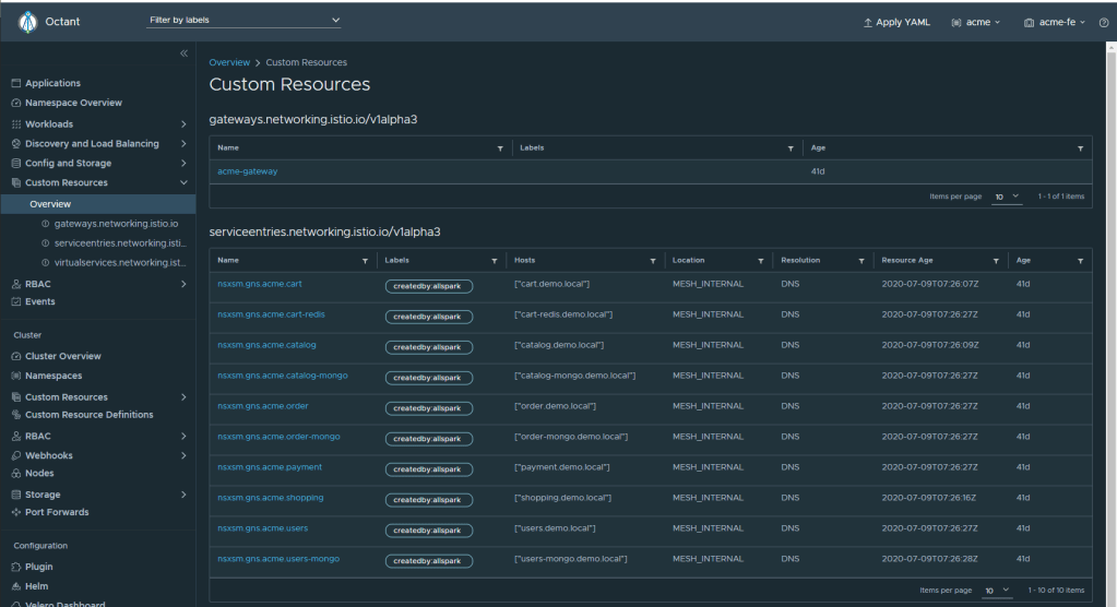 We can manage CRD’s in a namespace, for example Istio service mesh, or policies that will apply on a NS level. In the example below i am managing VMware Tanzu Service Mesh objects on a Tanzu Kubernetes Grid Cluster directly from the Octant dashboard