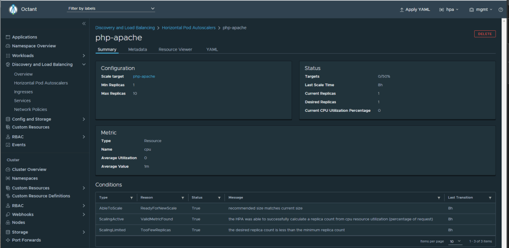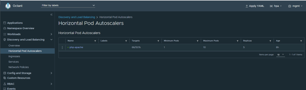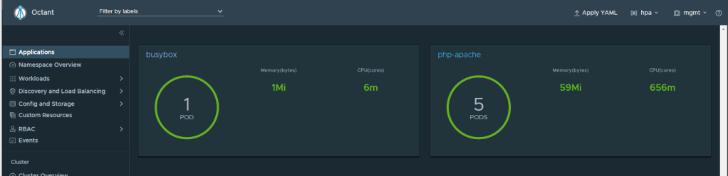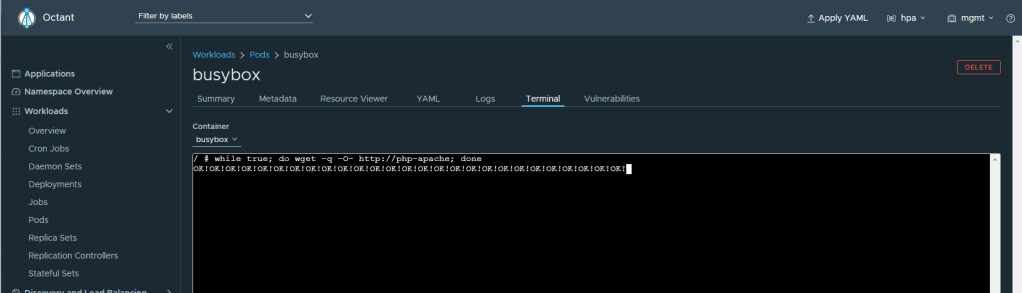 Lets check the HPA capabilities. to do so we need to load the PHP demo app, for that I deployed the busybox pod in the same namespace. We can get open the shell of the pod inside Octant dashboard in the POD view, the equivalent to running ‘kubectl exec’ (which is very cool)