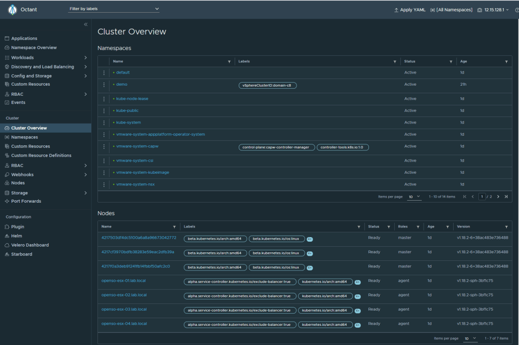 In the cluster level we can manage the nodes, namespaces, resources, CRD’s and other cluster level objects. In the example below i’m managing a vSphere cluster that has a Tanzu supervisor cluster. This mean that i’m running Kubernetes the control plane for my vSphere environment