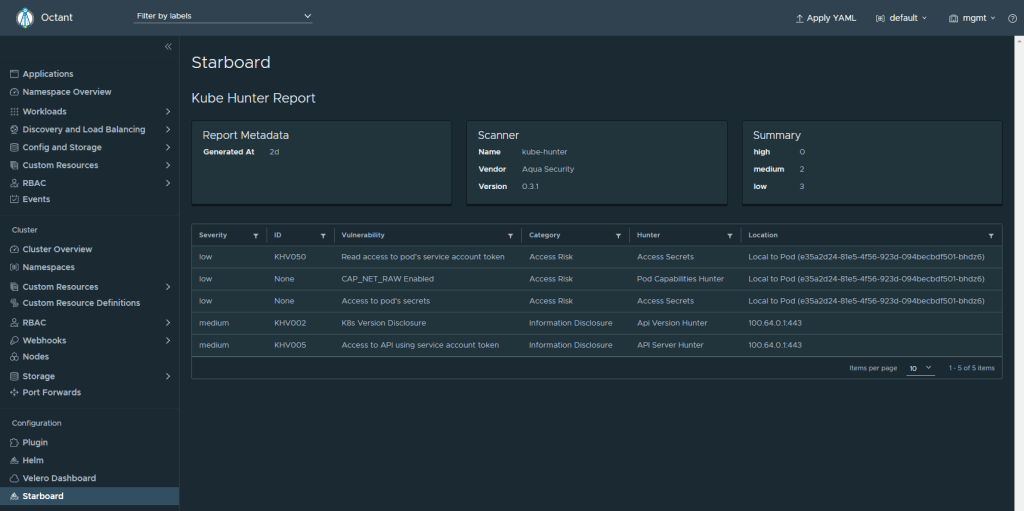4. Aqua-Starboard pluginview security aspects of the cluster and application like vulnerability assessment and security configuration