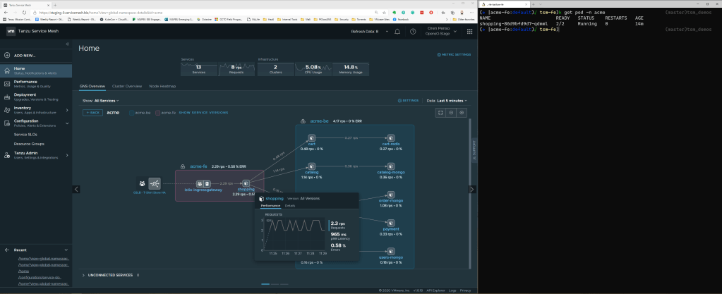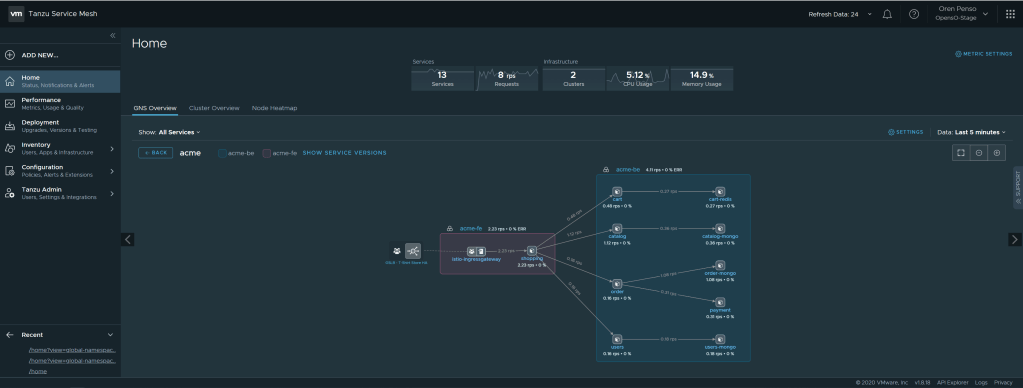 In this demo, I’m distributing the services in multiple clusters, where the Acme frontend service in Kubernetes is called “shopping” and all the backend services run on a separate cluster. When you connect those objects under the same global namespace, you will have a service discovery map. This can work not only across clusters in the same site, but also across clouds, check out the following blog about how far you can take this. The screenshot below is from my GNS: