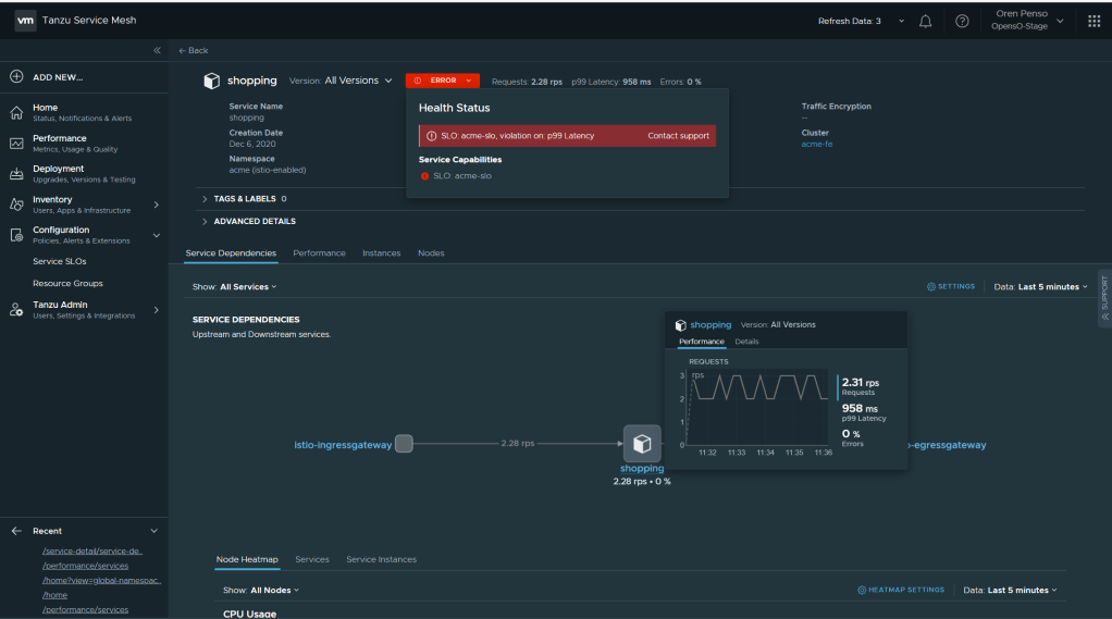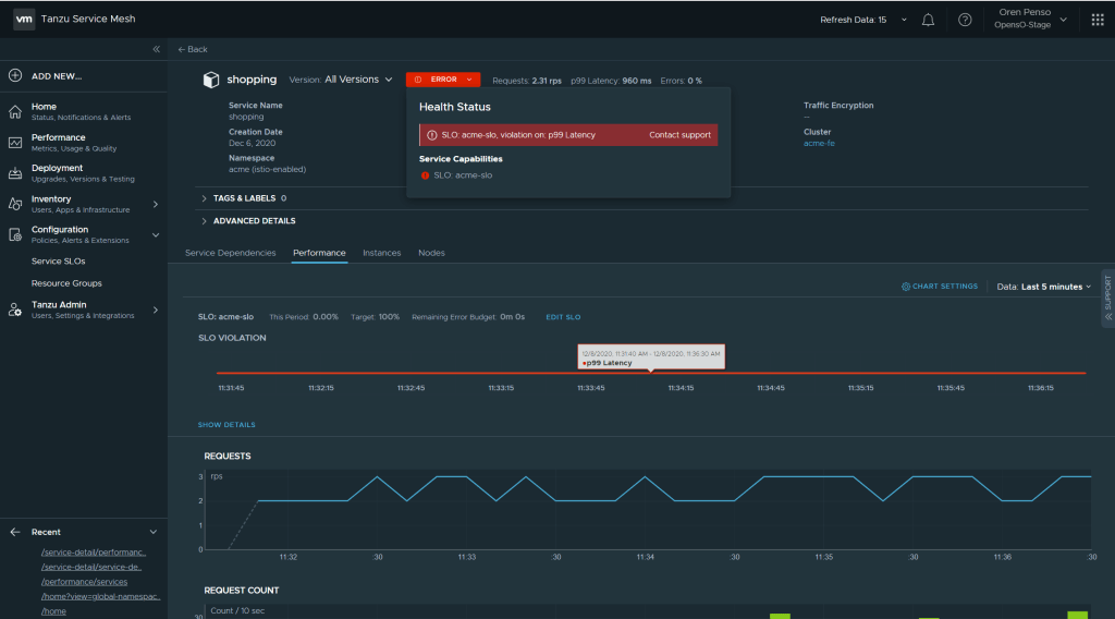 By Applying that policy I can immediately see the error and violation of the policy in the performance page of the “shopping” service