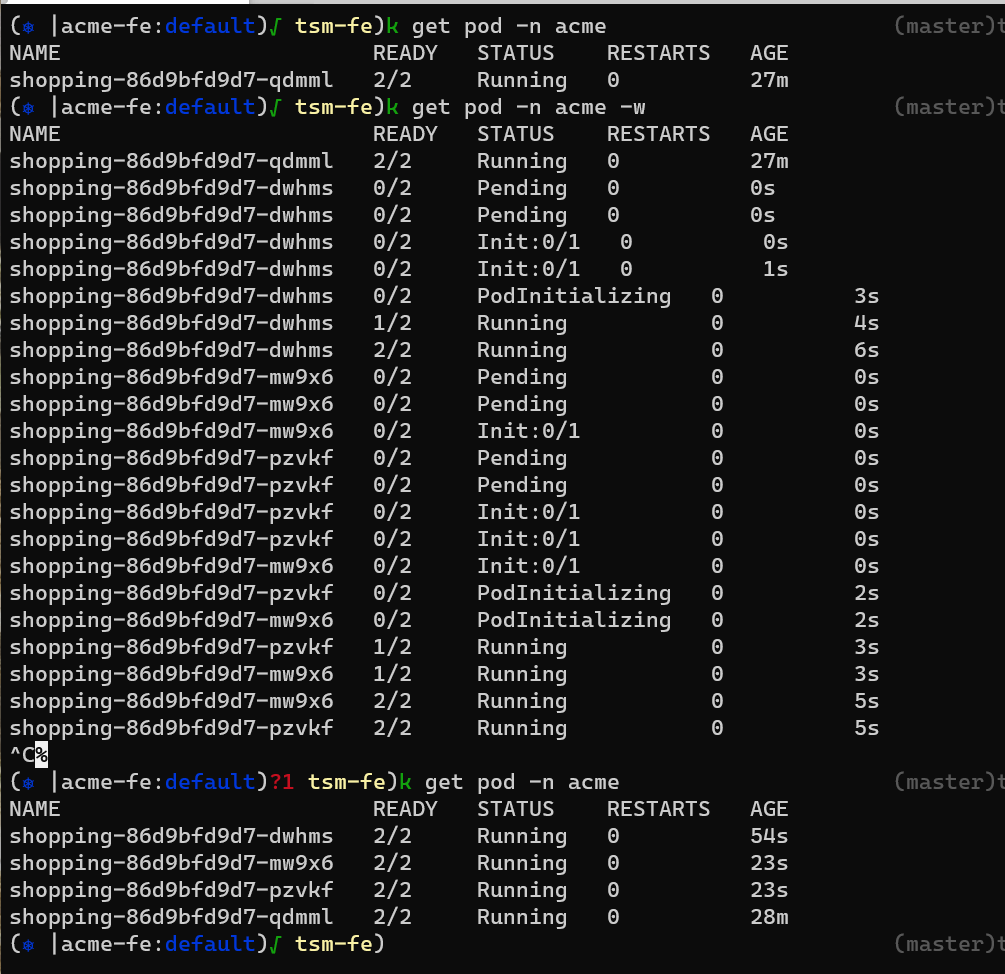 Now on the Kubernetes side I can see that the deployment is being scaled out automatically to meet the demand of the threshold and bring me back to the intended state.