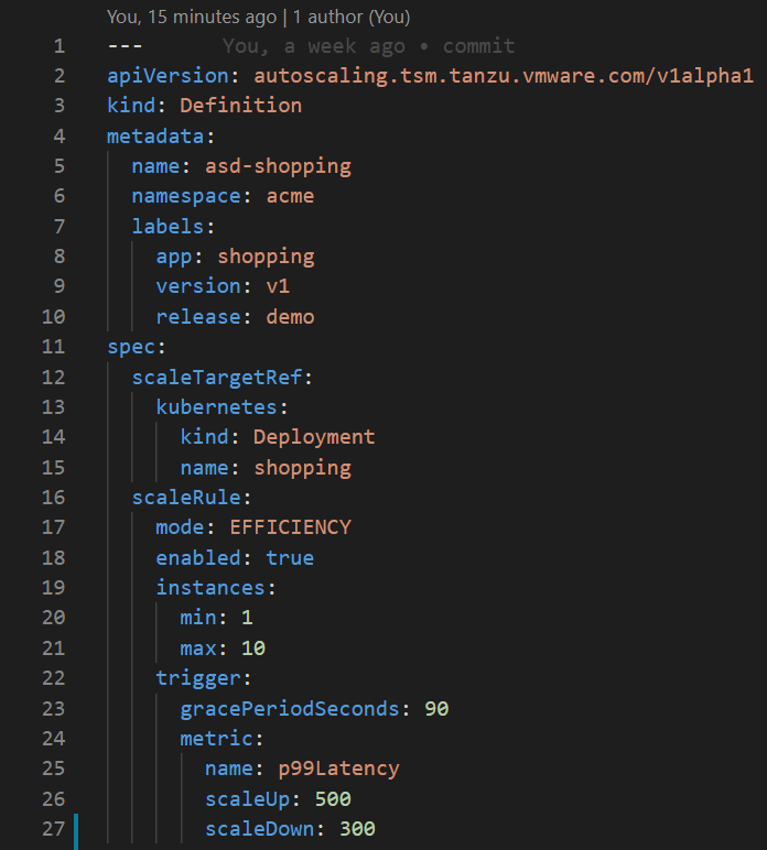 With Tanzu Service Mesh declarative SLO’s you can configure a definition of user experience SLI’s like p50, p90, p99 latency (p50=50% of transactions, p90=90% etc.) or performance metrics like CPU consumption, request per second and more. With that configuration, you can now get notified when that SLO is being violated and understand the health state according to that. The really cool science-fiction part is where you can act on that definition using a distributed autoscaler to auto-scale your application deployment and bring you back to your intended state or SLO. That SLO definition of the application is declared in the Kubernetes clusters that are part of the Global Namespace in TSM with a new custom resource definition (CRD) autoscaling.tsm.tanzu.vmware.com.